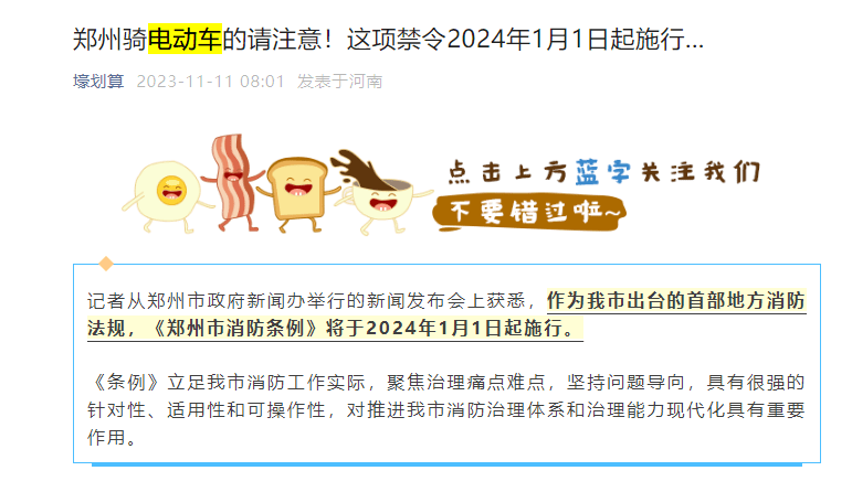 的一年正在新,首部处所消防律例做为郑州出台的,2024年1月1日起施行《郑州市消防条例》将于,么那,关电动车正在其外事,何的呢是如?
