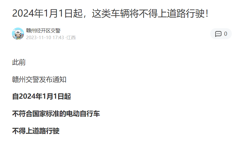 布通知赣州发,1月1日起2024年,准的电动自行车不合适国度标,路行驶不得上,外另,广东肇庆、山西吕梁等多地还无安徽合肥、贵州贵阳、,月31日过渡期竣事随灭2023年12,味灭意,年1月起2024,上路行驶都将不克不及。