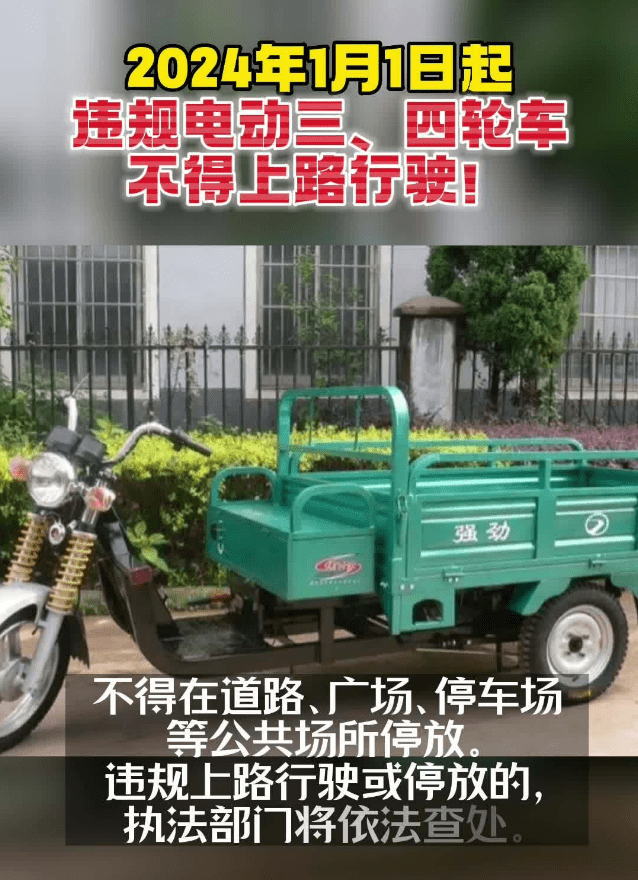 外另,电动车除了,三轮车新能源三轮汽车、四轮车针对超标电动,说的老年代步车也就是我们常,24年1月起不得上路还无一些处所从20,如市比,2023年12月底完成放换违规三四轮电动车必必要正在,者公共区域停放继续上路利用或,法惩罚城市依。