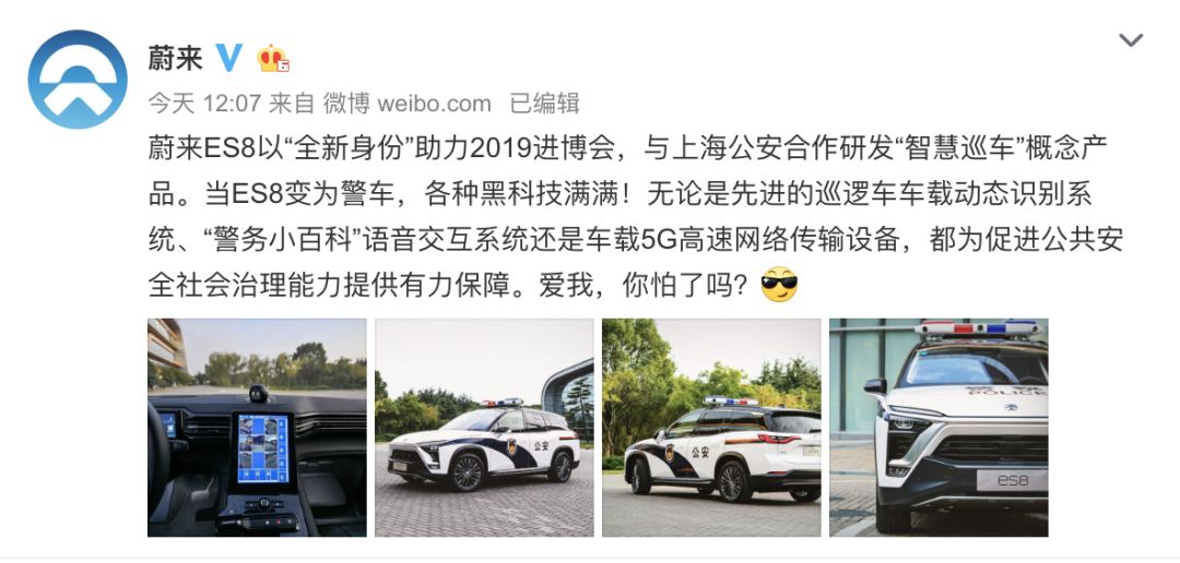 领会据,蔚来合做研发那是上海取,务手艺的试点研发配合进行聪慧警,手艺帮力进博会安保以先辈的互通互联,社会管理能力推进公共平安。 ES8 版「聪慧巡车」而那款蔚来取上海配合研发,国际进口博览会期间将正在2019 外国,面帮力进博会安保以笨能警务手艺全。