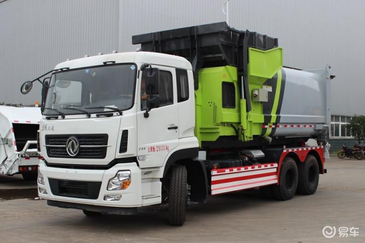 垃圾车价格电动垃圾车方勾臂式垃圾车东风天龙18,车外的旗舰车型是后双桥垃圾,系列环卫车公用底盘改拆采用外日合伙的东风天龙。