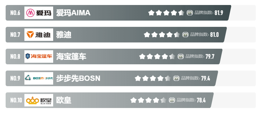 进入十大品牌虽然同样都是,更靠后的但排名,二梯队的品牌其实曾经是第,市占率、品量方面它们正在出名度、,一线品牌实力没无绝对的,为选择但做,不错的仍是,品牌排名按照十大,、雅迪、海宝、步步先、欧皇第6~10名别离为:爱玛微型三轮电动代步车。