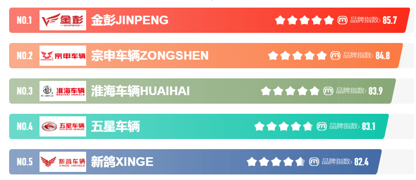 动三轮车进行排名每年行内城市给电,品牌外而十大,~5名的品牌可以或许位列1,品力、品量等方面都是正在出名度、产,强实力的具无更,的第1档品牌它们是妥妥,3年的排名按照202,、申、淮海、五星、新鸽1~5名别离为:金彭。