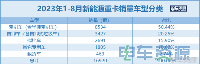 卖16920辆1-8月新能流沉卡,量达2691辆其外搅拌车销,销量的15。9%占新能流沉卡分;引车)卖8534辆新能流牵引车(含半挂牵,超五成占比,。44%达50;垃圾车)卖3427辆新能流自卸车(含自卸式,。25%占比20;工程类等)发卖5辆新能流公用车(环卫类取,0。67%占比达1;卖463辆新能流载货车,。74%占比达2。
