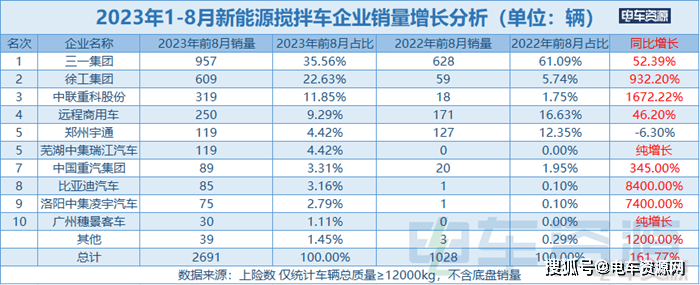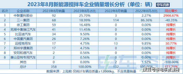 车卖358辆8月份新能流搅拌,(132辆)同比客岁8月,两倍出缺销量删加,71。21%同比删加1。