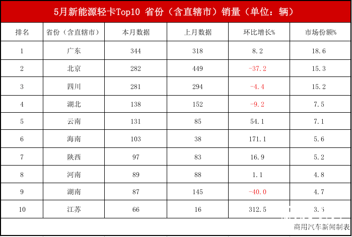 分布上正在地域,2年5月202,流轻卡销量最高的三大省市广东、、四川仍然是新能,282辆和281辆别离达到344辆、,5。2%和15。2%占比18。6%、1。外其,量升至第一广东超越销,上月均无必然程度下滑、四川销量和占比相较。外此,陕西四省销量落幅较着江苏、海南、云南、,对新能流轻卡的推广力度那申明了更多省份加强了,卡市场逐步扩大使得新能流轻。