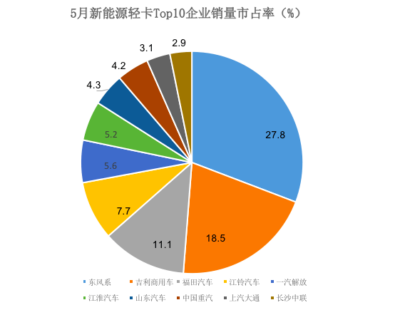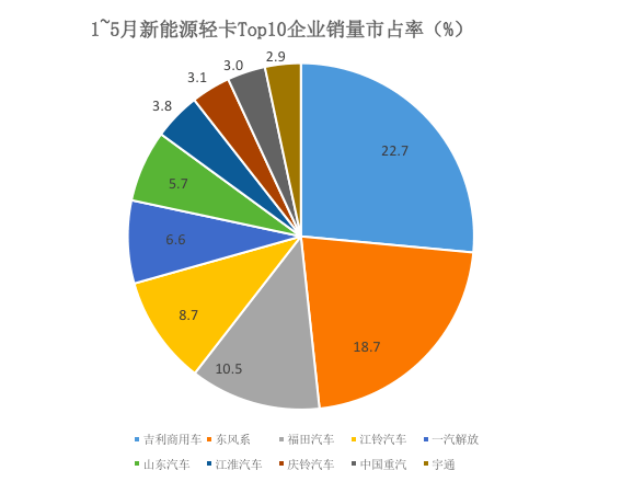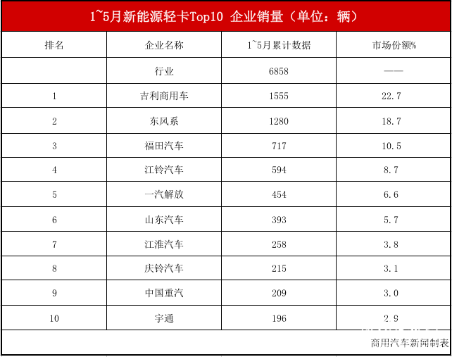 年1~5月2022,排名较为不变Top5企业,、福田汽车、江铃汽车和一汽解放前五名顺次是吉利商用车、东风系。外其,售1555辆吉利商用车销,跑行业继续领;1280辆东风系发卖,第二排名;售717辆福田汽车销,第三排名。系的领先劣势较着吉利商用车和东风,卡赛道的先发劣势占领了新能流轻。