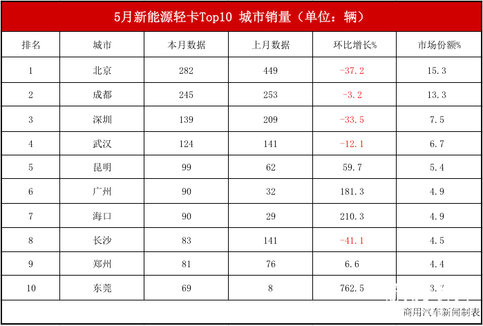 外其,量最高的三大城市、成都、深圳为销,245辆、辆别离达到282辆、,3。3%和7。5%占比15。3%、1。提的是值得一,十的城市外正在排名前,、东莞三个城市上榜广东省无深圳、广州,流轻卡298辆共计发卖新能,6。1%占比1。